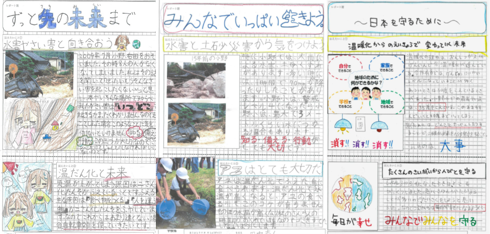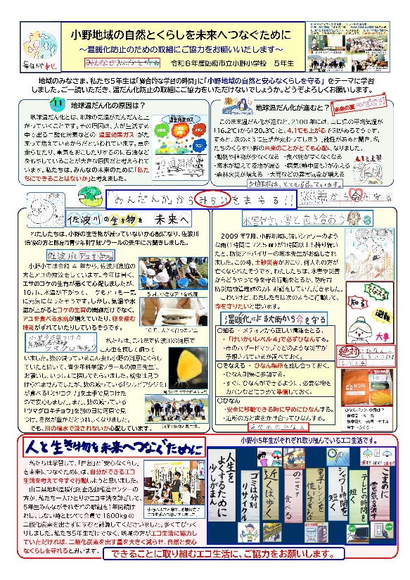 自分の暮らす地域の自然と安心な生活を守ることについて児童が思いを出し合うところから学習が始まり、地球温暖化防止を軸として、小野地域の「生物が命をつなぐ環境を守るために活動」と「大雨・土石流に対する地域防災に取り組む」の二つのテーマで探求的な学習が進んでいった。学習のまとめでは、関係機関のご支援で自分達の思いを地域に発信して協力をお願いしようという活動まで行なうことができた。児童はこの学びの過程の中で、自分の考えや行動を地域の方が受け入れてくださった喜びと、わずかかも知れないが、小野地域のよりよい未来づくりへ自分達が参画できたのではないかという達成感を感じていた。