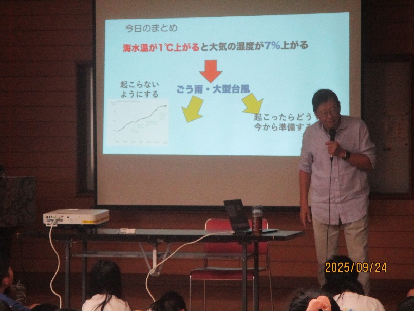 そして、子どもたちの学習をさらに深めるために、地球温暖化防止全国ネット高田理事長を招いて、地球の環境問題について講演いただきました。1学期に調べてきた環境についての学習が、近年起きているさまざまな環境問題を引き起こしていることに気がつくことができました。また学校全体で行っているESD学習講演会では「生物多様性」のお話をしていただき、生き物たちが支えている生態系が崩れると、私たち人間にも大きな影響を及ぼすことを学習しました。