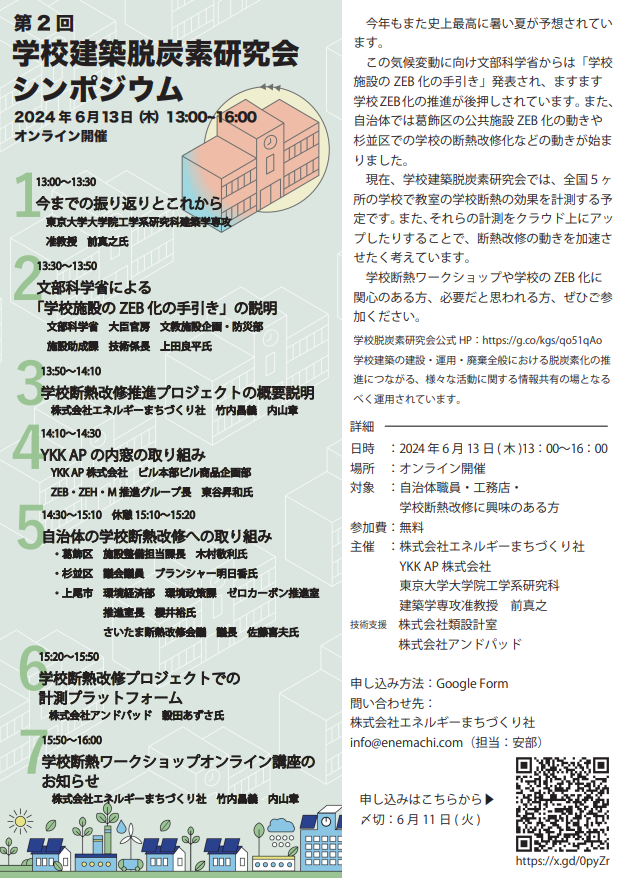 | ⑦15:50~16:00 | 学校断熱ワークショップオンライン講座のお知らせ 株式会社エネルギーまちづくり社 竹内昌義 内山章 |