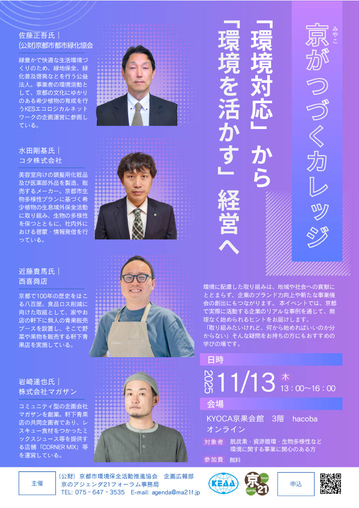 本イベントでは、京都の地域で実際に活動を展開している企業の事例に学び、無理なく始められるヒントを提供します。
