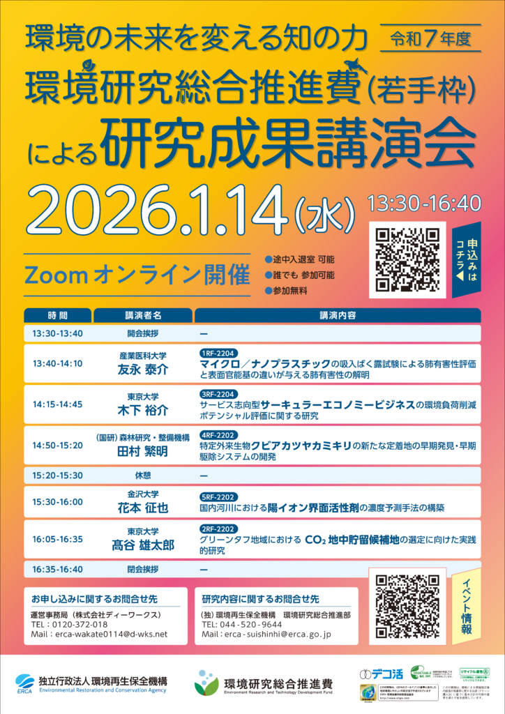 独立行政法人環境再生保全機構では、「環境研究総合推進費(若手枠)」により実施された研究成果の普及を目的として、研究成果講演会を開催します。