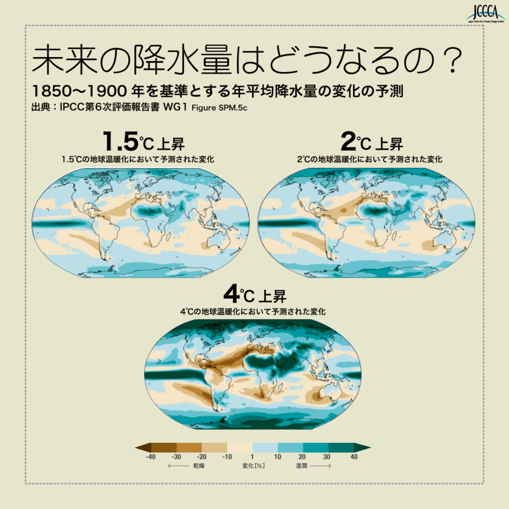 陸域の平均降水量は1950年以降増加しており、1980年代以降はその速度が上昇したと発表しています。また、今世紀末(2081~2100年)の年平均降水量は、1995~2014年と比べて、最大で13%増加するとの予測を発表しています。世界規模では地球温暖化が1℃進行するごとに、極端な日降水量の強度が約7%上昇するという予測もなされています。